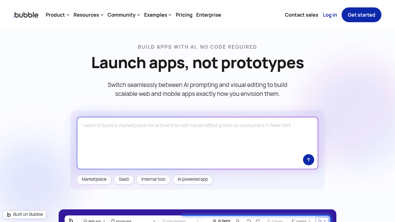 Bubble is a visual web development tool for building custom web applications from scratch. It provides a full programming environment where you design logic workflows, database schemas, and responsive layouts through a visual interface.